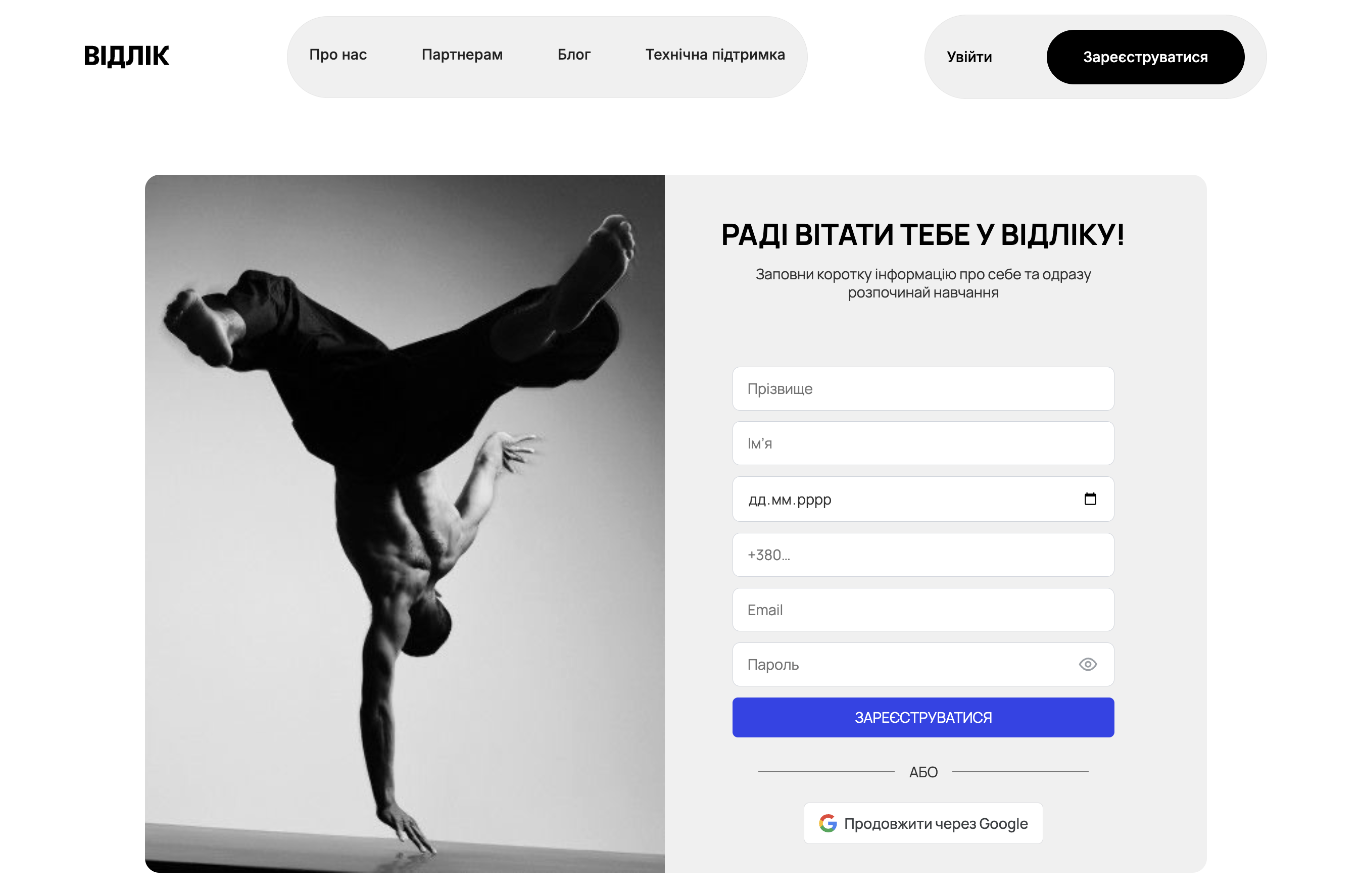 Ти обираєш рівень складності (початківець чи профі) і стиль танцю, який хочеш освоїти, та проходиш швидку реєстрацію.